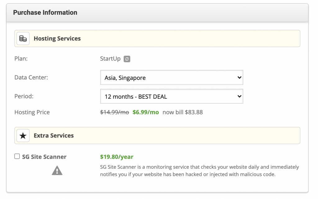 Period: You can choose how long you want the hosting for. SiteGround provides best offer if you choose the Billing Period to be of 12 Months. You can renew the hosting after 12 months.