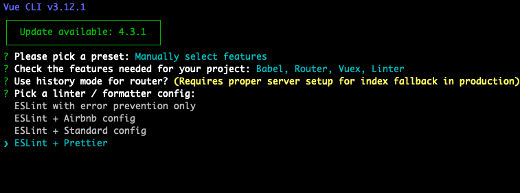 In the next step, Vue will ask which Linter we want to go with, I prefer ESLint + Prettier