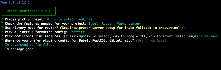 Next Up, Vue CLI asks where do we want to place the config for Babel, PostCSS, and ESLint. Either in dedicated config files or everything in package.json file.
