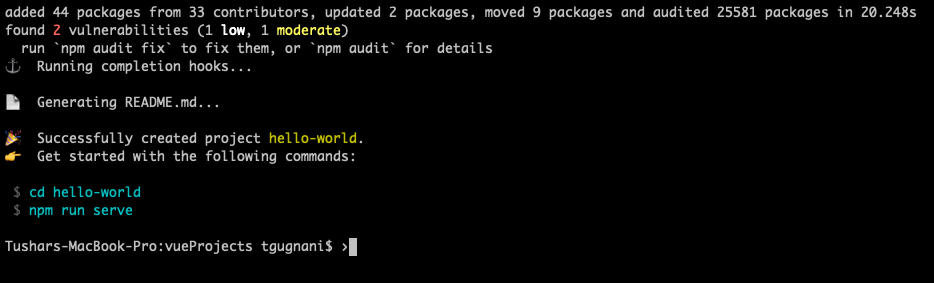 Vue CLI now starts downloading all the dependencies and starts creating a new Vue Project for me.