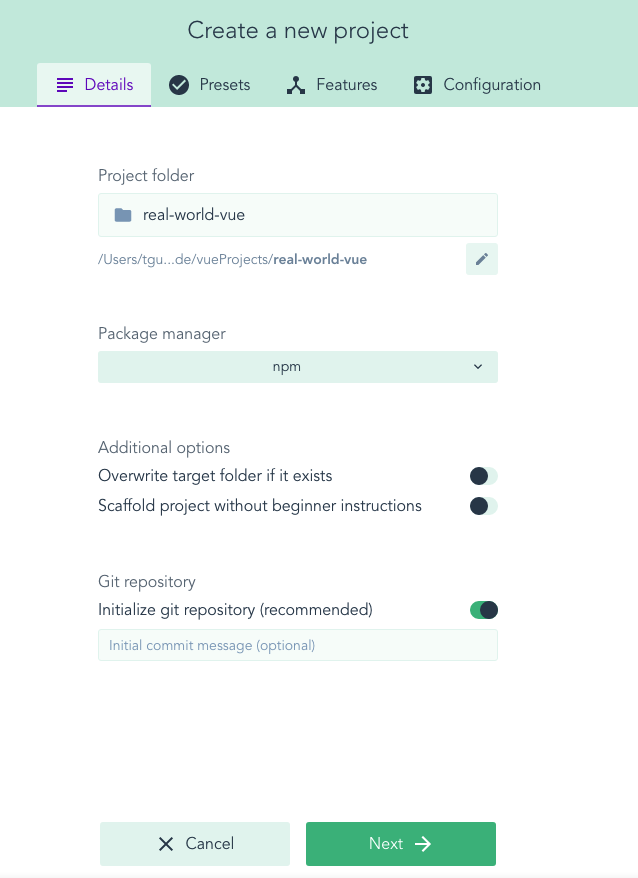 In this first step, you can provide the project name, choose the package manager, and it also gives you an option to choose if you want to initialize a git repository.
