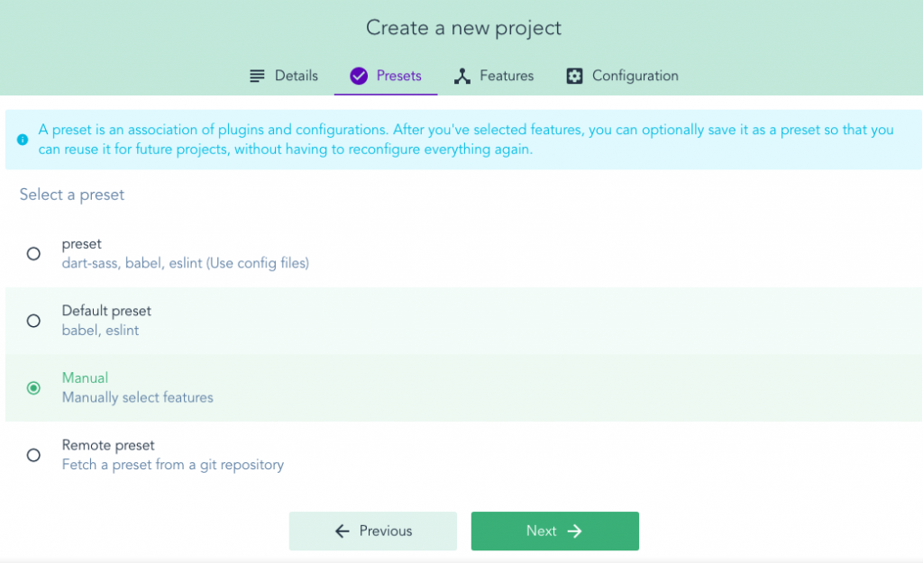 Click Next, it will ask you to choose the default configuration for our project. I am choosing the Manual option
