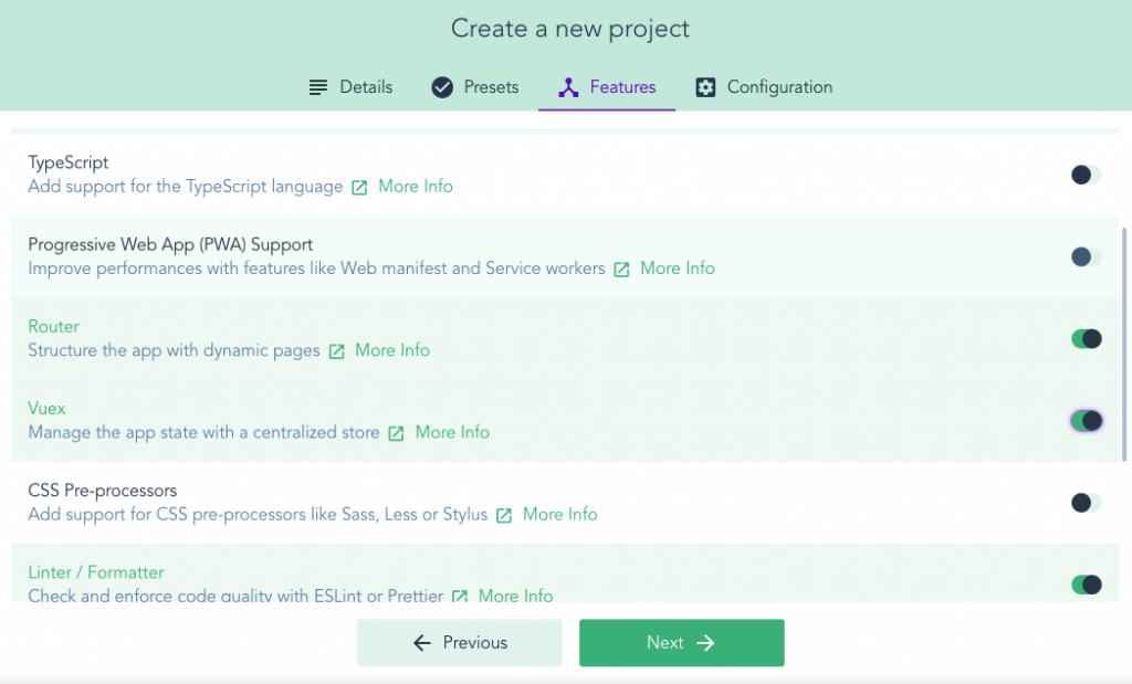 The next step asks you to select which all features you want in your project. For this project I going with Babel, VueX, Router, and Linter.