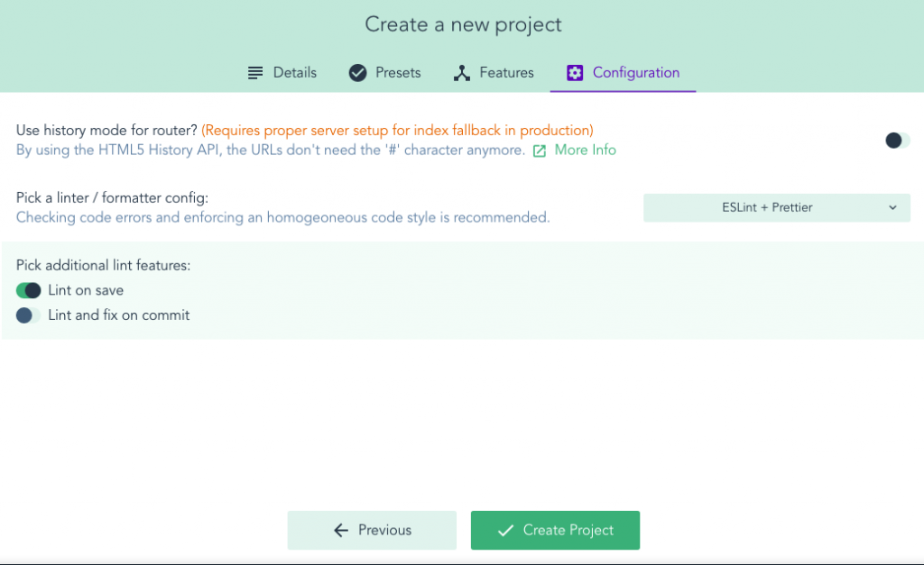 Since we have chosen a Linter in the configuration, Vue UI will present us with another screen where it will ask us to pick a linter and pick additional lint features.