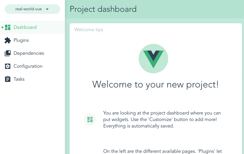Once the project is created, you can see the project dashboard along with the options in the left sidebar which includes plugins, tasks, configuration etc.