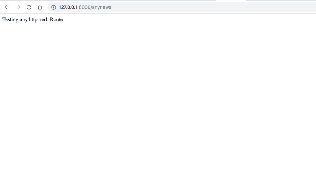 Type http://127.0.0.1:8000/anynews in url. It will return the text Testing any http verb Route as in Route.It will call the anynews whatever the http verb may be.