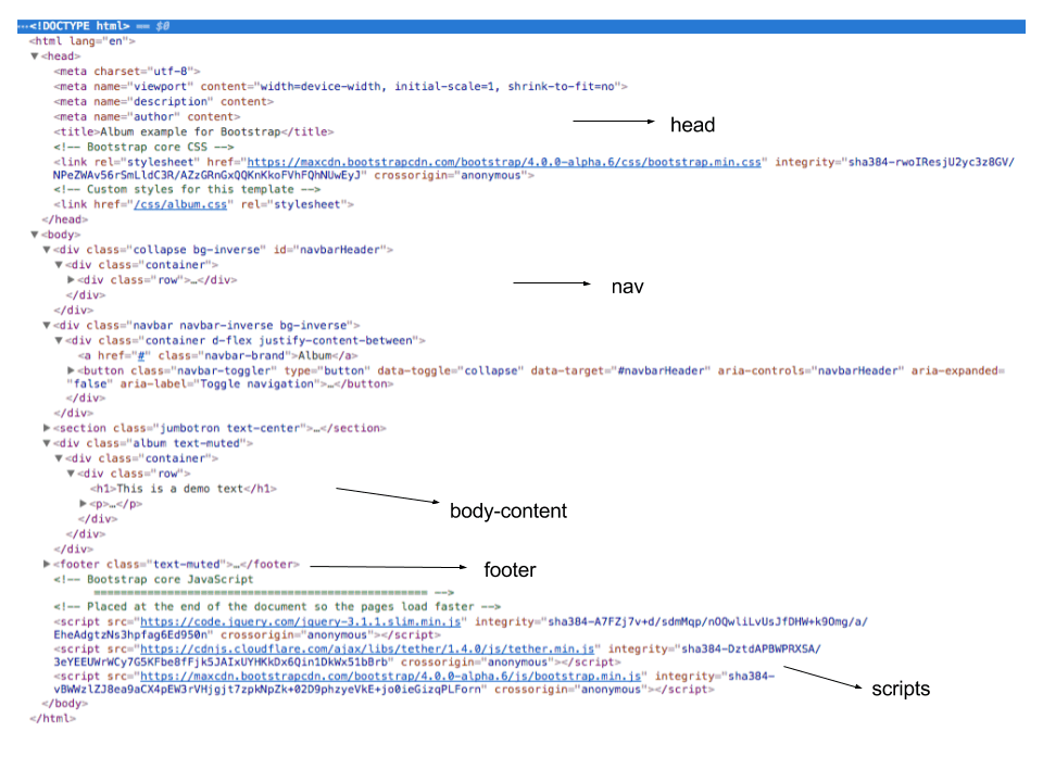 As you can see in the bootstrap example source code, a file consist of a different parts, and we will create a layout in which we will keep all the partial parts of the layout separate.