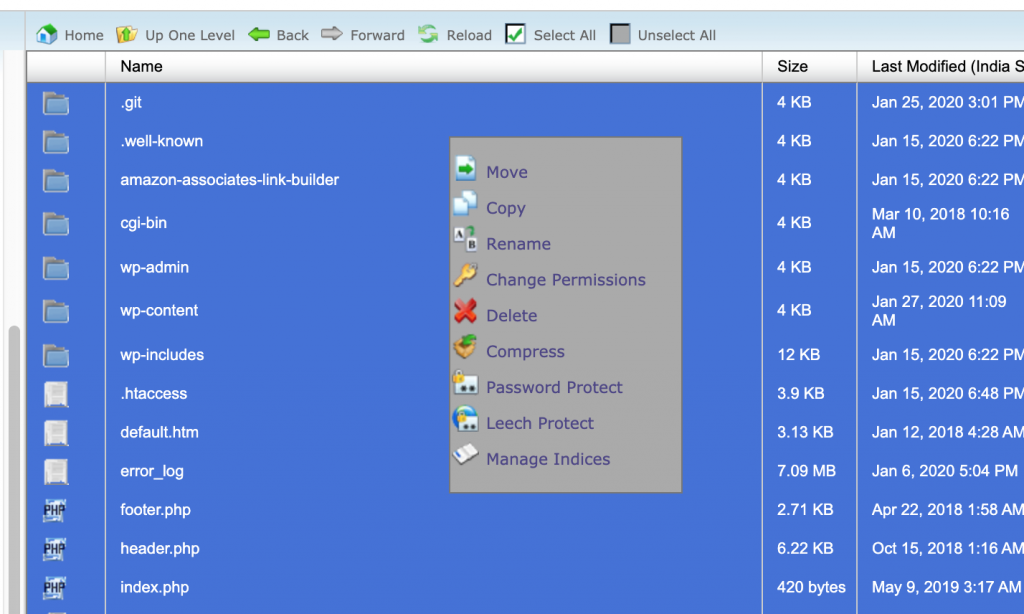 If there is a folder inside the public_html directory that contains all your WordPress core files, then move inside the folder, select all the files, right-click to select Move. And move all the files to the public_html directory.