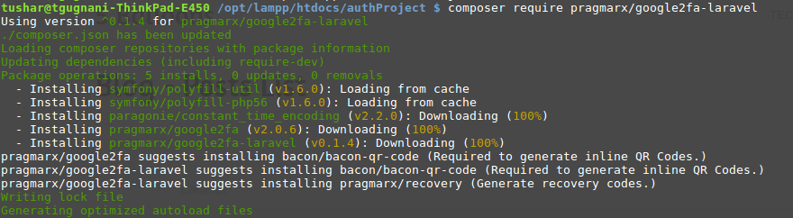 First let's setup the required packages, this will help us implement Google2FA backed two factor Authentication into our project. Open you terminal move to the project root. Execute following commands.composer require pragmarx/google2fa-laravel
