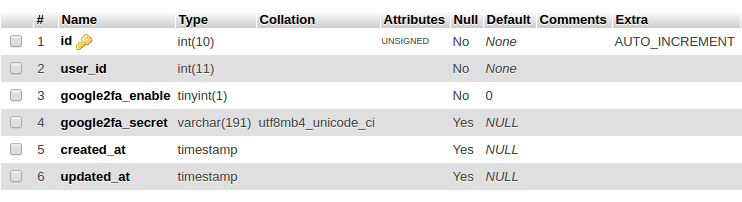 google2fa_secretwhich will be used to store the random secret key used to authenticate and verify user's 2FA Authentication.