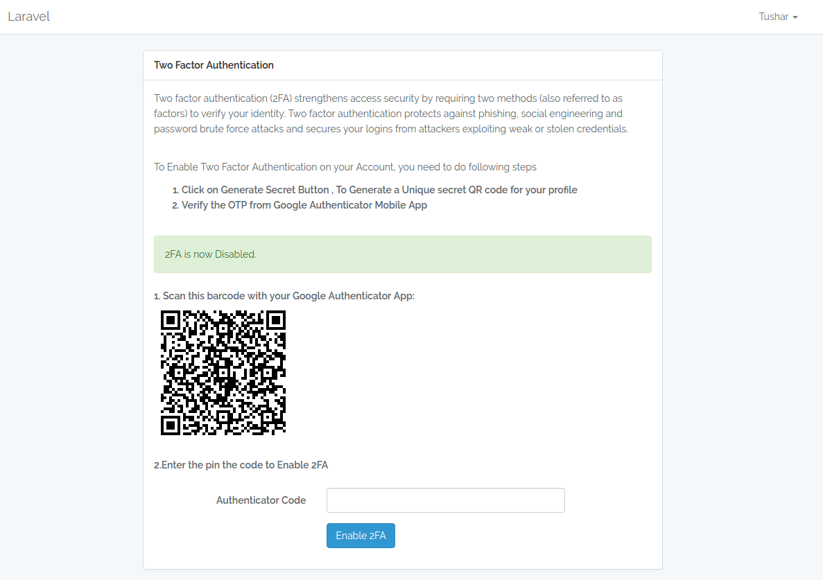 Laravel Two Factor Authentication (Google2FA) Demo[/caption]