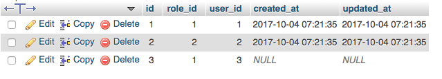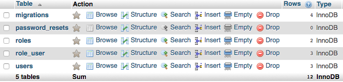 Running the migrate command creates following tables in your database. You can choose to fill the data for testing either manually or via Seeding.